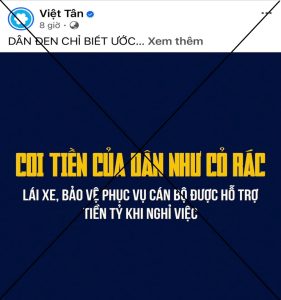 Thời gian gần đây, một số trang mạng xã hội có liên quan đến tổ chức phản động Việt Tân lan truyền hình ảnh với nội dung mang tính kích động như: “Coi tiền của dân như cỏ rác – Lái xe, bảo vệ phục vụ cán bộ được hỗ trợ tiền tỷ khi nghỉ việc.”. Đây là thông tin không chính xác, bị xuyên tạc, bóp méo sự thật, lợi dụng tâm lý bức xúc của người dân nhằm chống phá Nhà nước, gây chia rẽ niềm tin giữa nhân dân và chính quyền, đặc biệt là với đội ngũ cán bộ công chức.